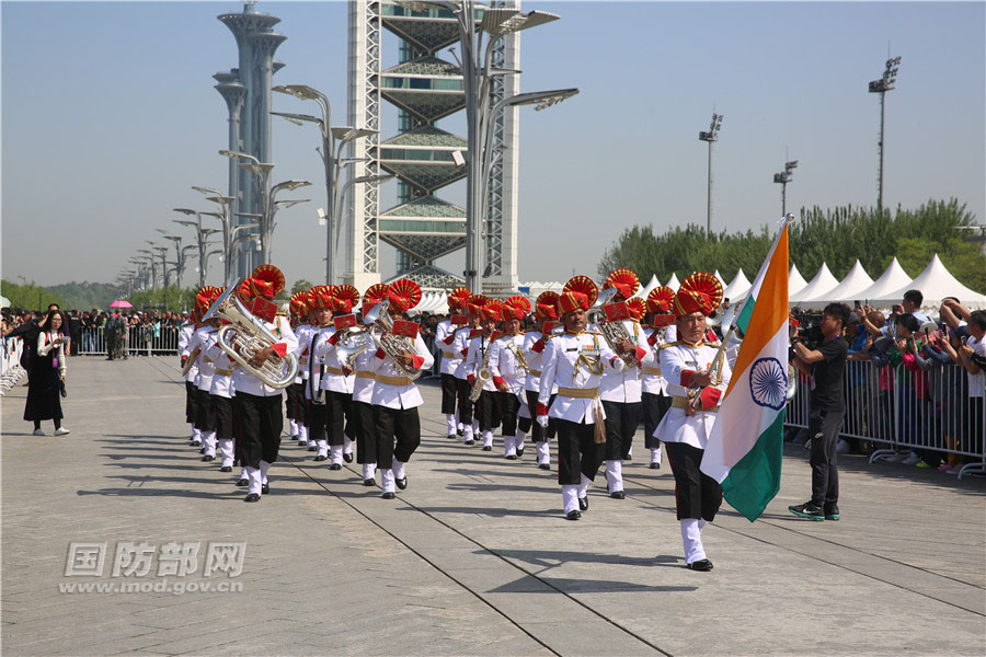 圖為印度陸軍軍樂團在巡游現場演奏。 焦國慶 攝