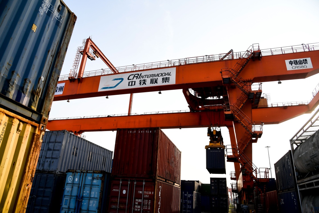 5月7日,在“中鐵聯(lián)集青島中心站”,龍門塔吊往“青島號”中亞國際班列上裝載貨物。李紫恒 攝