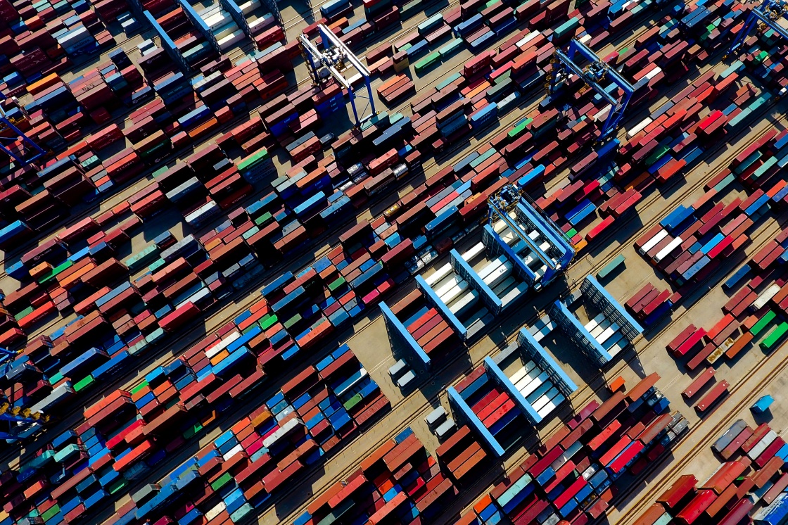 這是5月4日無(wú)人機(jī)拍攝的青島港前灣自動(dòng)化集裝箱碼頭堆放的集裝箱。李紫恒 攝