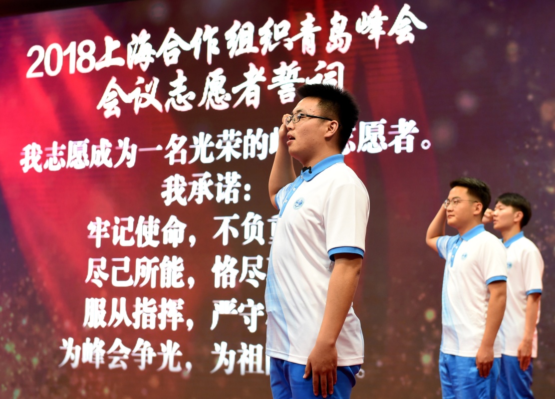 5月24日,上合青島峰會會議志愿者代表在出征儀式上宣誓。李紫恒 攝