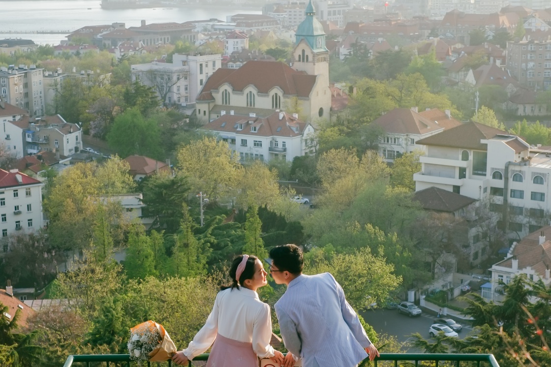 一對新人在青島信號山拍攝婚紗照。張鋮 攝