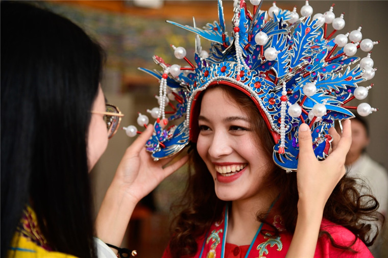 2017年8月15日,“魅力非遺——第二屆上海合作組織夏令營·非物質文化遺產交流體驗”活動在貴州省黔東南苗族侗族自治州丹寨縣萬達小鎮舉行。這是外國手工藝人在古法造紙體驗館了解花草紙的制作過程。
