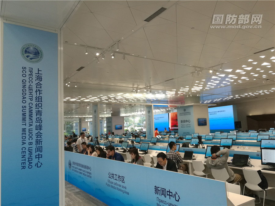 中外記者在上合青島峰會新聞中心展開工作。羅錚 攝