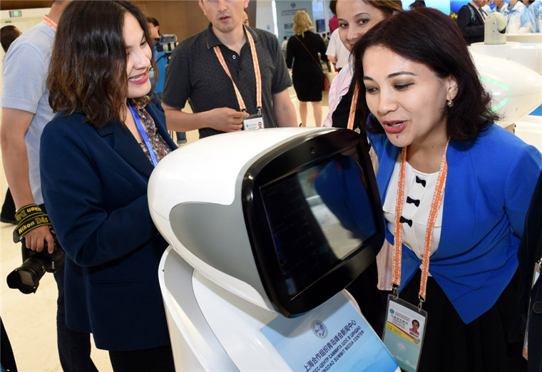 6月8日,一名來自烏茲別克斯坦的記者(右一)在上合青島峰會新聞中心與機(jī)器人互動。新華社記者 李紫恒 攝