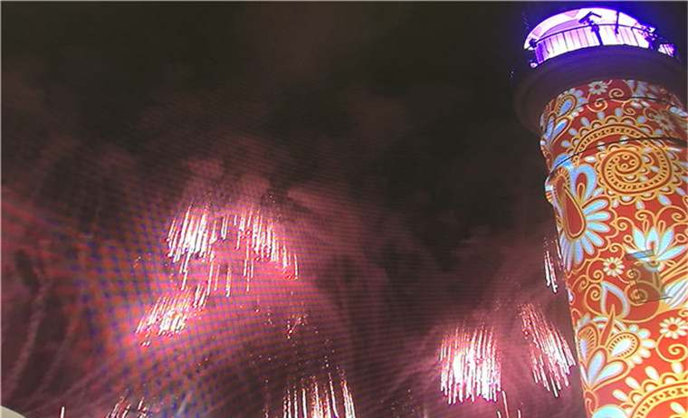 這是世界上第一次從橫跨海陸近5公里立體空間的大型煙火燃放,配合近百座樓體燈光秀,從水、陸、空多層空間結合最新燃放技術,展出了一場獨一無二的燈光焰火秀;