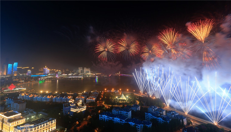 6月9日至10日,上海合作組織青島峰會在山東青島召開。這是9日晚在青島舉行的《有朋自遠(yuǎn)方來》燈光焰火藝術(shù)表演。新華社發(fā)(王南 攝)