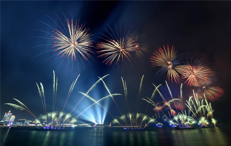 6月9日至10日,上海合作組織青島峰會在山東青島召開。這是9日晚在青島舉行的《有朋自遠方來》燈光焰火藝術表演。新華社記者 馬寧 攝