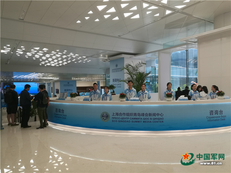 志愿者在上合青島峰會新聞中心提供服務保障。任旭 攝