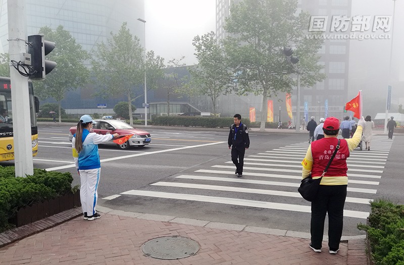 早晨的青島在薄霧籠罩中,城市志愿者在交通路口提供服務保障。青島,進入“上合時間”,青島人民進入“上合狀態”。任旭 攝