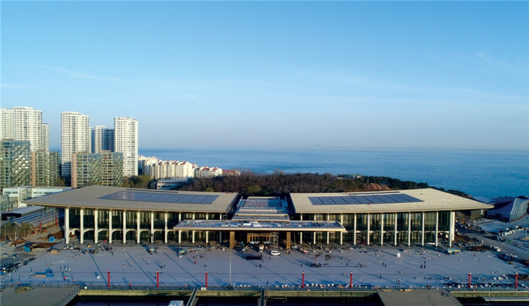 上合青島峰會主會場外景(5月18日攝)。新華社發(中建八局供圖)