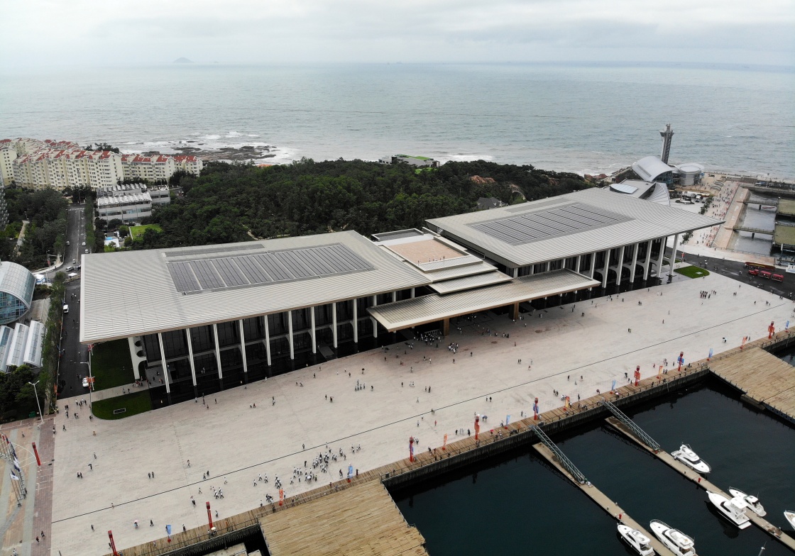 這是7月1日無人機拍攝的開放后的青島奧帆中心內的峰會主會場——青島國際會議中心。李紫恒 攝
