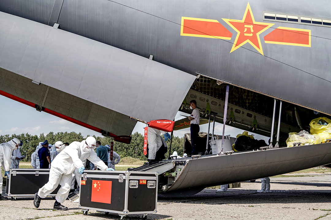 8月9日,我軍參加“國際軍事比賽-2021”的部分官兵搭乘運-20運輸機抵達俄羅斯莫斯科后卸載物資。 新華社記者 劉藝 攝