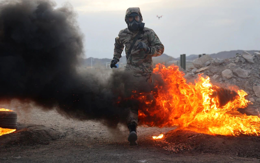 參賽隊穿過烈火黑煙快速通過被毀房屋 尹萬同 攝