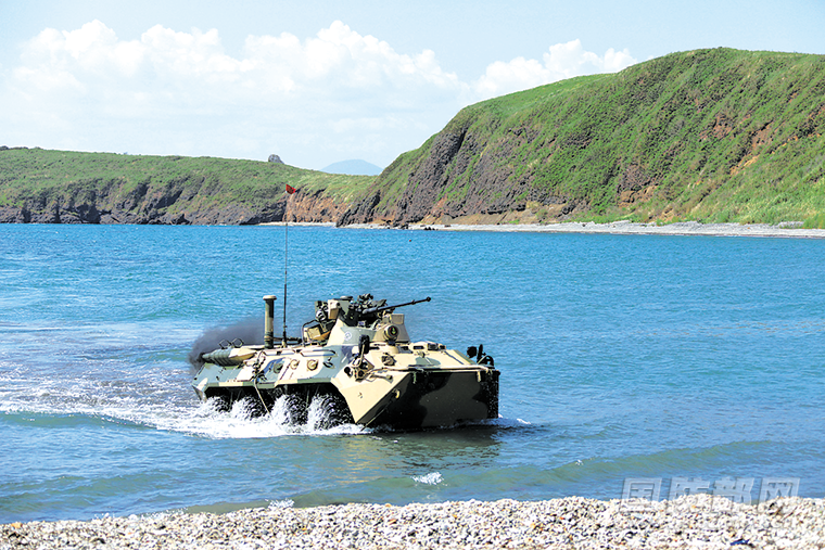 8月18日,在“海上登陸”項目接力賽的訓練中,我參賽隊員駕駛裝甲車快速上岸。 肖勇利攝