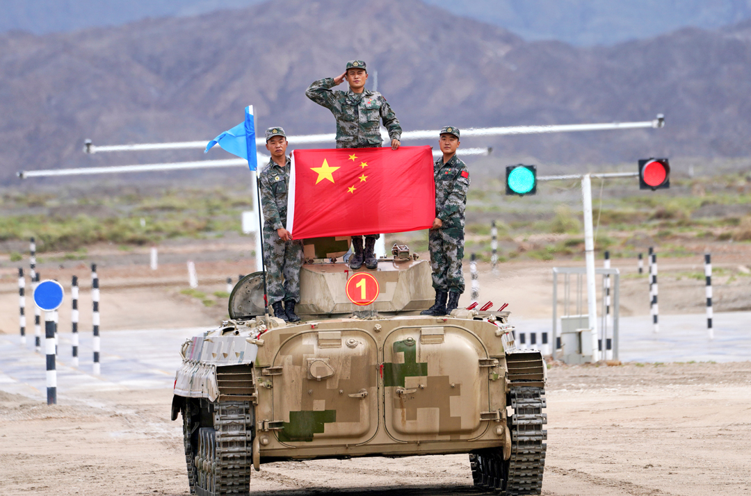 8月30日,“國際軍事比賽—2021”中國庫爾勒賽區“蘇沃洛夫突擊”項目舉行最后一次單車賽,中國參賽隊完成比賽后展示國旗。 張永進 攝