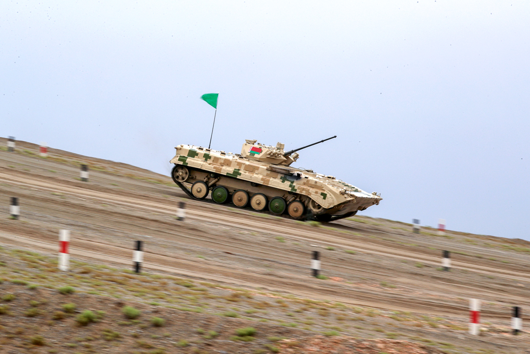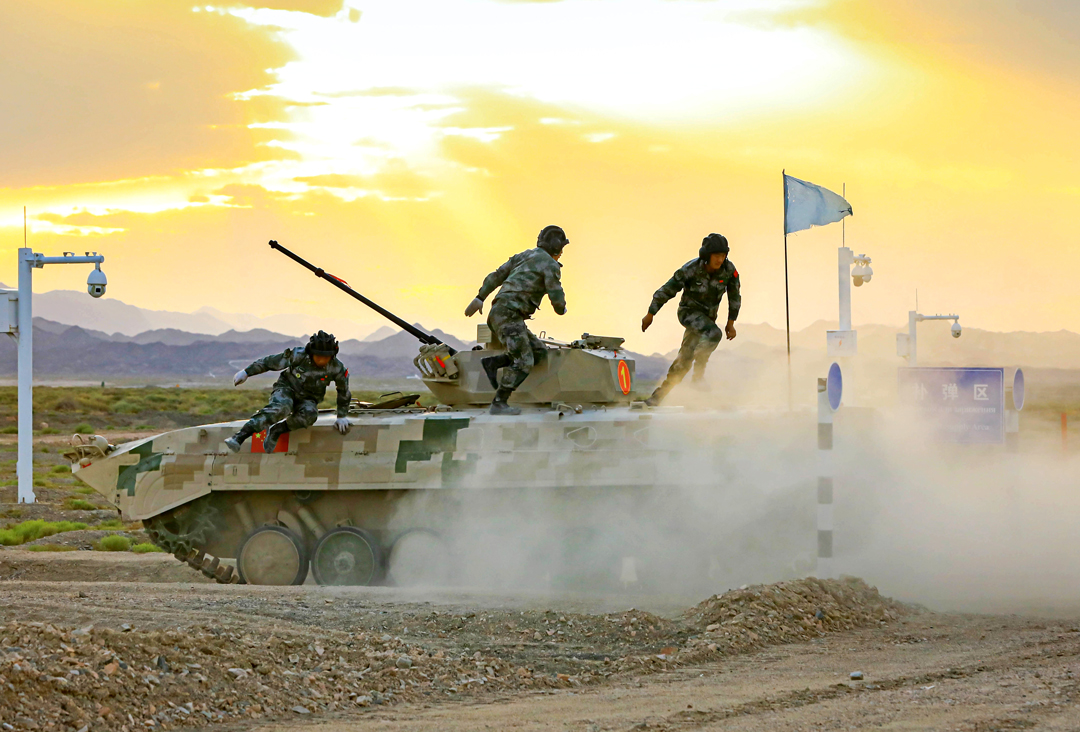 8月30日,“國際軍事比賽—2021”中國庫爾勒賽區“蘇沃洛夫突擊”項目舉行最后一次單車賽,中國參賽隊駕駛步戰車通過煙火路段。 羅興倉 攝