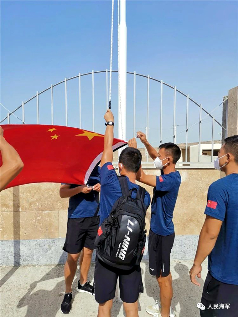 ▲參賽隊員升起中國國旗。 周雪偉 攝