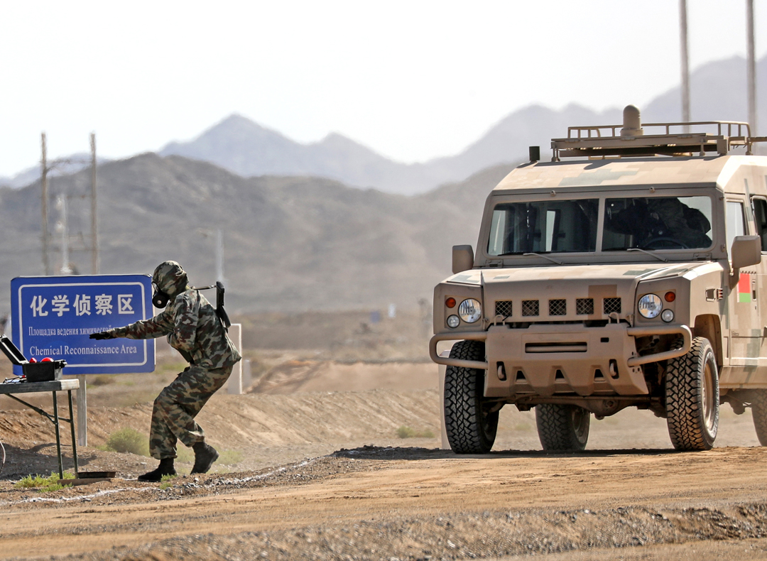 8月31日,“國際軍事比賽-2021”中國庫爾勒賽區(qū)“安全環(huán)境”項目舉行接力賽,白俄羅斯參賽隊進行化學偵察。 羅興倉攝