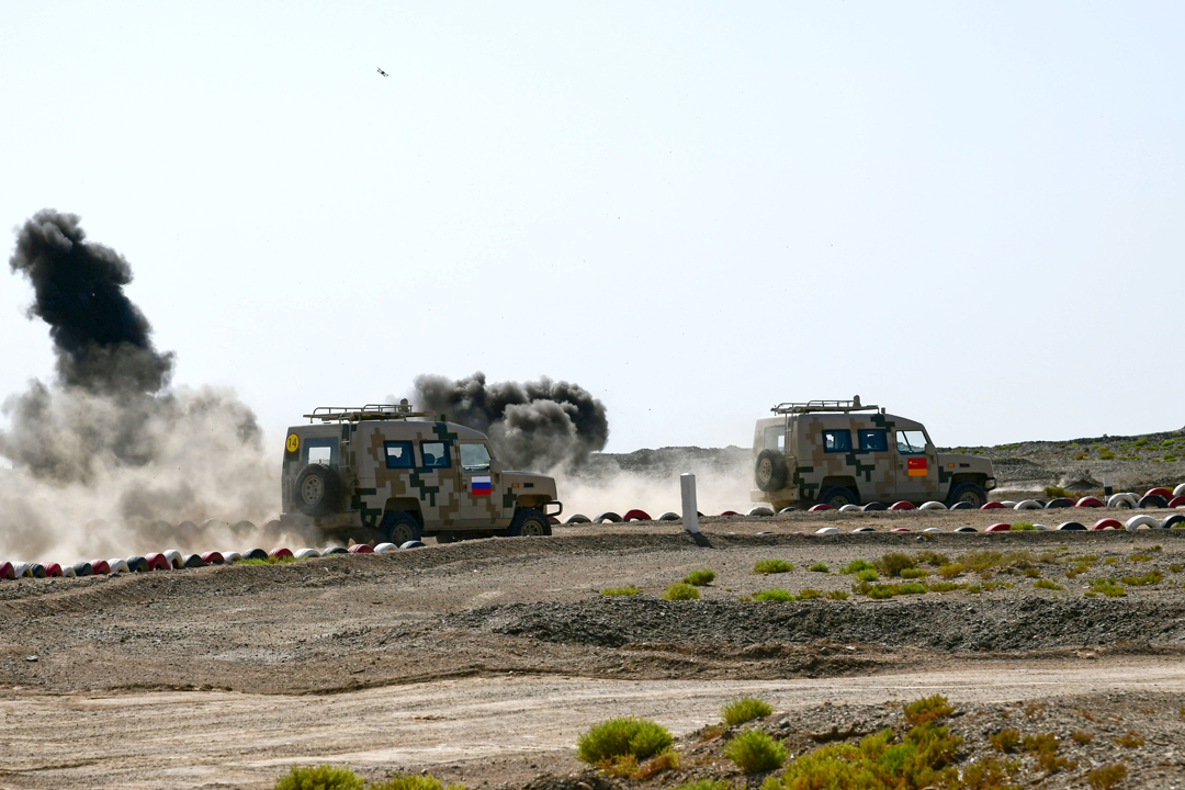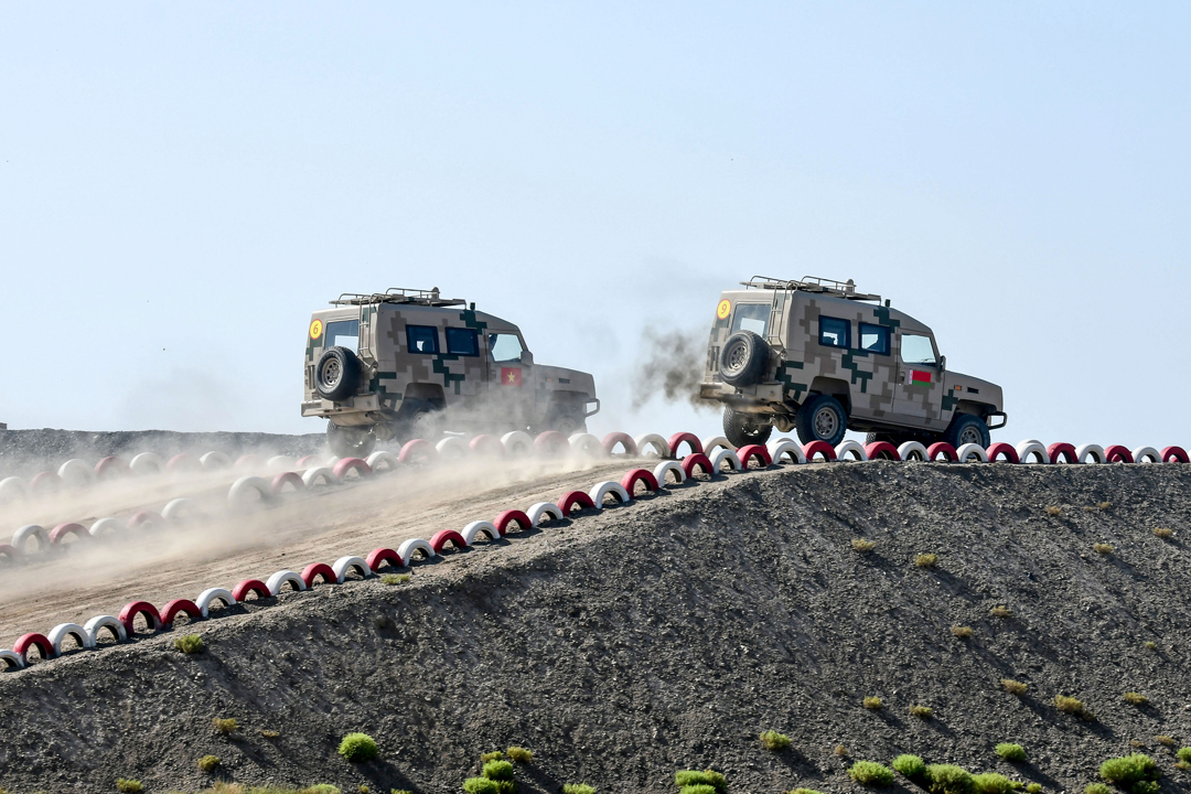 8月31日,“國際軍事比賽-2021”中國庫爾勒賽區(qū)“安全環(huán)境”項目舉行接力賽,越南參賽隊與白俄羅斯參賽隊飛躍車轍橋。 趙煜 攝