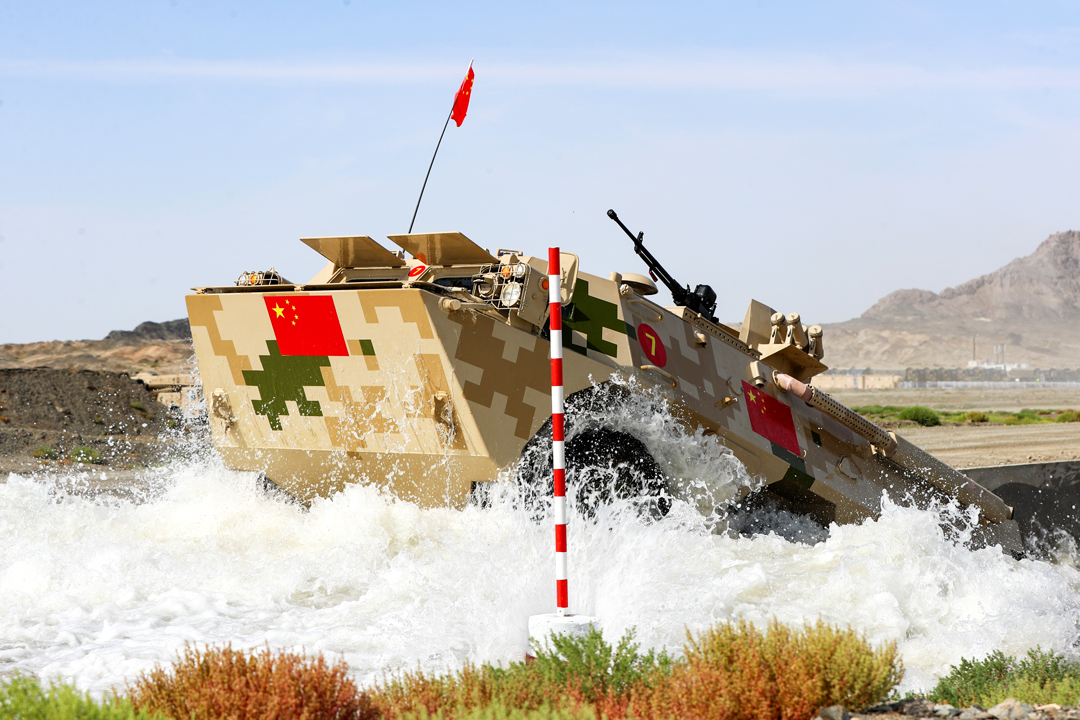 9月1日,“國際軍事比賽-2021”“晴空”便攜式防空導彈班組項目綜合賽在新疆庫爾勒賽區舉行,中國隊摘得第一名。至此,“晴空”項目所有比賽結束,中國隊獲全部比賽第一,并奪得團體冠軍。這是參加綜合賽的中國參賽車組通過涉水場。 新華社發 姜東坡 攝