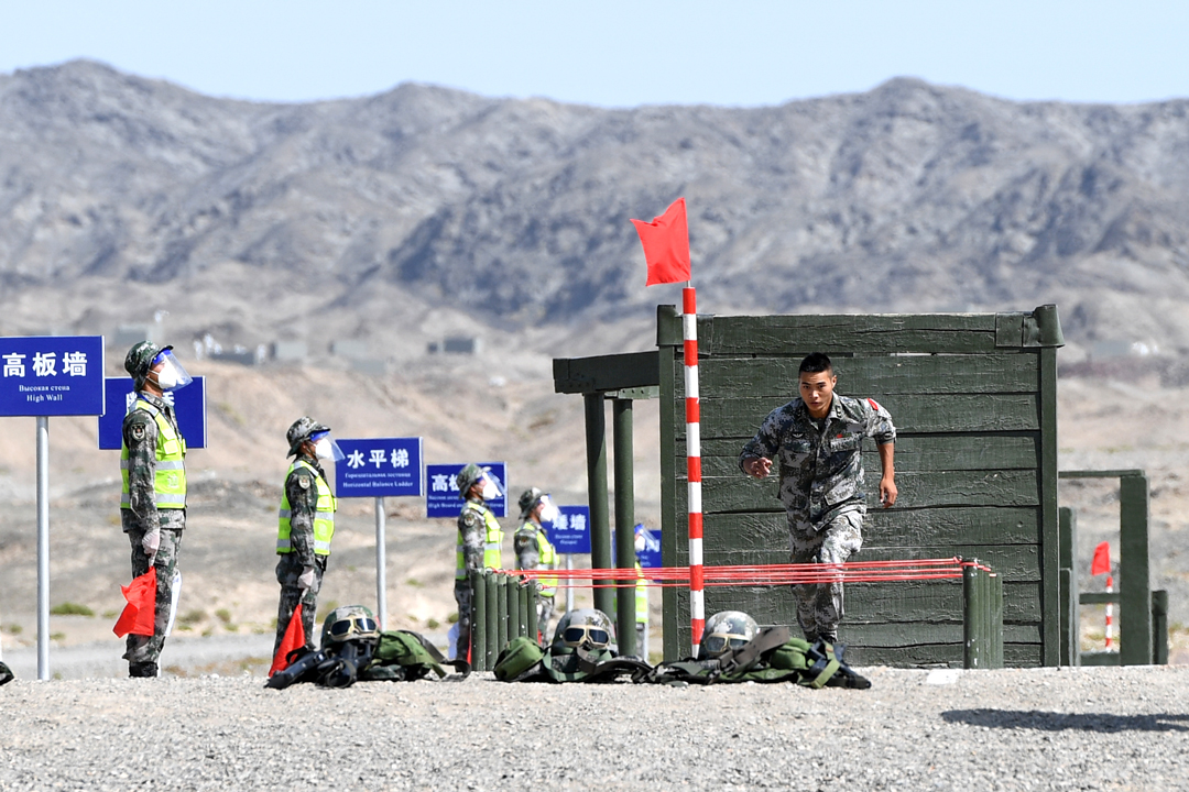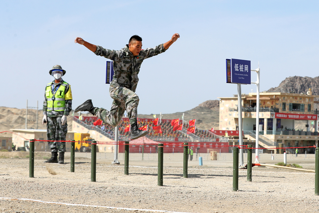9月1日,“國際軍事比賽-2021”“晴空”便攜式防空導彈班組項目綜合賽在新疆庫爾勒賽區舉行,中國隊摘得第一名。至此,“晴空”項目所有比賽結束,中國隊獲全部比賽第一,并奪得團體冠軍。這是參加綜合賽的中國參賽隊員跨越障礙。 新華社發 姜東坡 攝