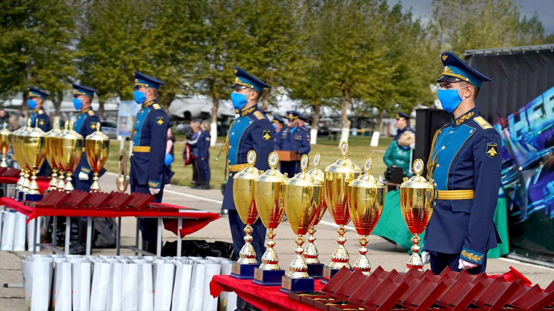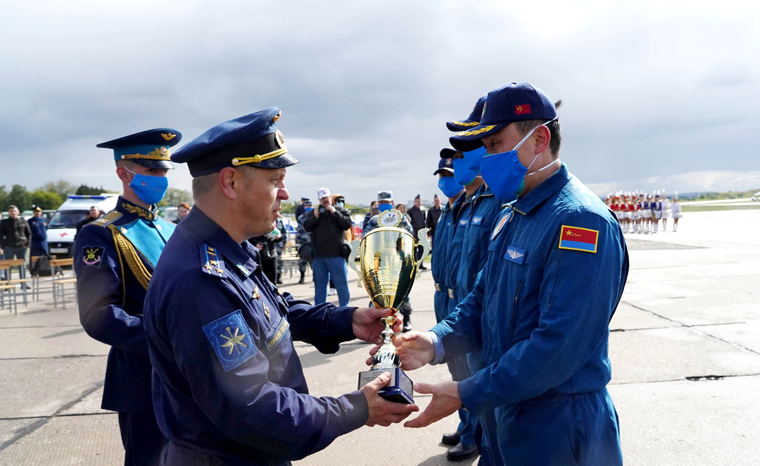 9月4日,在俄羅斯梁贊州佳吉列沃機場,中國空軍獲獎參賽隊代表在“國際軍事比賽-2021”“航空飛鏢”項目閉幕式暨頒獎儀式上領獎。 新華社發 許毅 攝