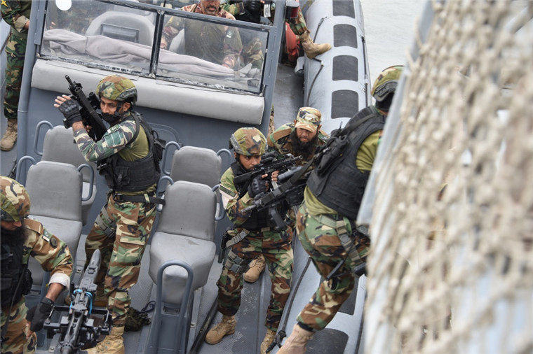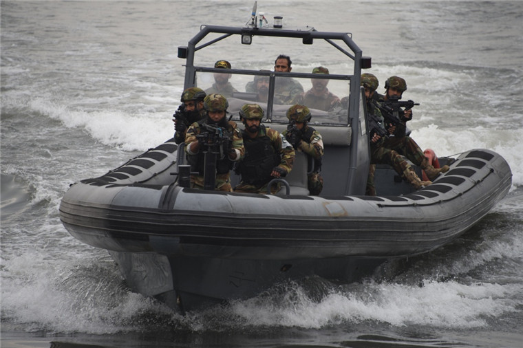 1月7日,參加“海洋衛士-2020”中巴海上聯合演習的巴基斯坦特戰隊員乘坐小艇快速靠近“可疑船只”。當地時間1月9日上午,“海洋衛士-2020”中巴海上聯合演習港岸階段圓滿結束。中巴混合艦艇編隊將于10日從巴基斯坦卡拉奇港解纜起航,前往位于北阿拉伯海的預定演習海域,展開第二階段即海上實兵實彈演練階段的演習。新華社記者黎云 攝