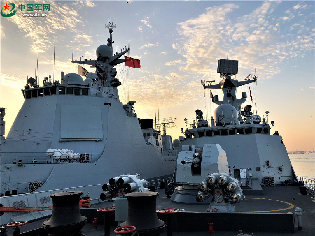 當地時間1月13日下午6點,落日余暉下,結束演練后肩并肩停泊在巴基斯坦卡拉奇軍港的我海軍導彈驅逐艦銀川艦(左)和護衛艦運城艦(右)。記者 董兆輝 攝