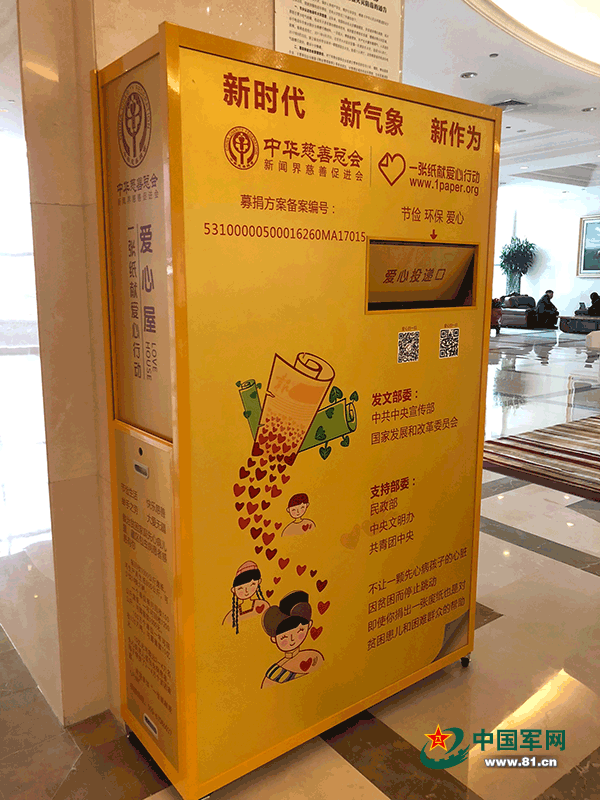 在華北賓館駐地一樓大廳,還設置了臨時郵局,滿足委員們的用郵需求。另外,現場的兩個“一張紙獻愛心行動”愛心屋,既方便了廢紙的回收利用,還傳遞了“節儉生活,快樂慈善”的理念,真心點贊!
