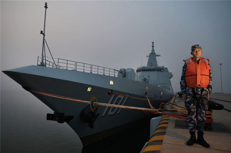 南昌艦戰士趙長誼在碼頭上。新華社記者 琚振華 攝