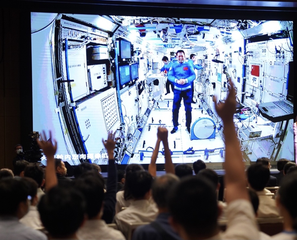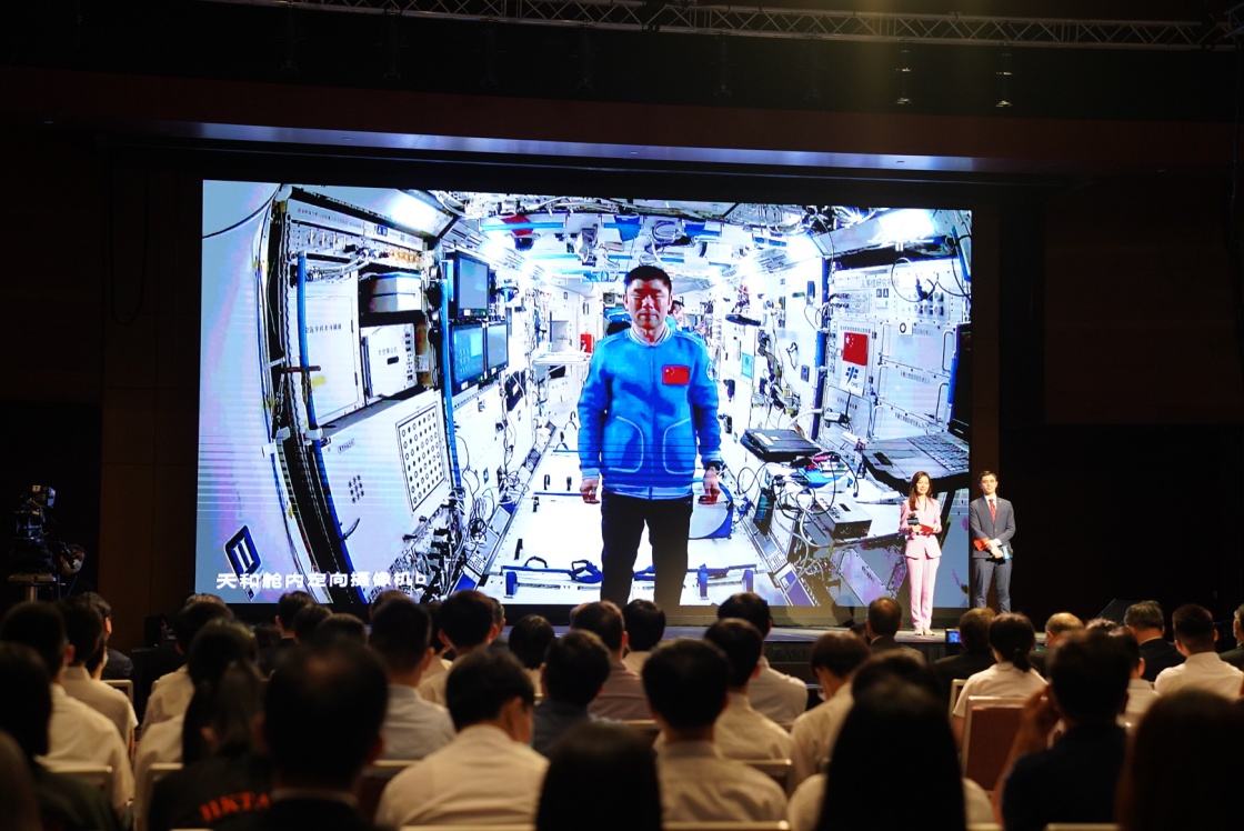 9月3日,正在天宮空間站執行任務的神舟十二號乘組與香港科技工作者、教師和大中學生進行天地連線互動。新華社記者 呂小煒 攝