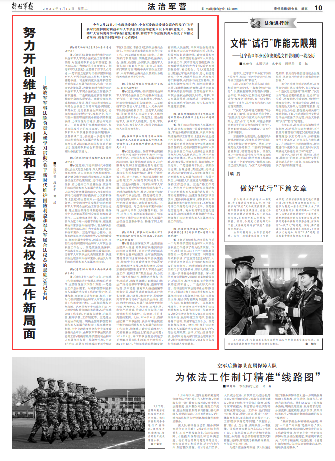 今年2月22日,中央政法委員會、中央軍委政法委員會聯合印發了《關于新時代維護國防利益和軍人軍屬合法權益的意見》(以下簡稱《意見》)。為幫助廣大官兵更好學習掌握《意見》精神,解放軍軍事法院負責人接受了本報記者采訪,就有關問題回答了記者提問。