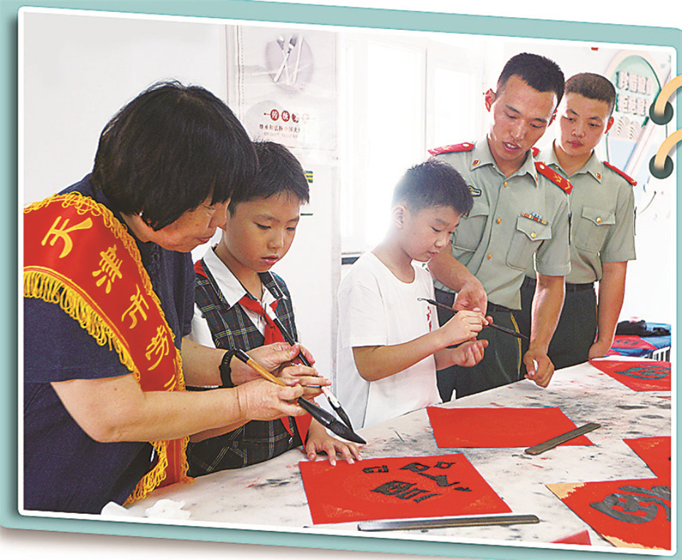 天津市和平區(qū)勞模協(xié)會成員與武警天津總隊執(zhí)勤第二支隊某中隊開展共建活動,活動中邀請當(dāng)?shù)匦W(xué)生一同參與書法展示環(huán)節(jié)。李勝利 攝