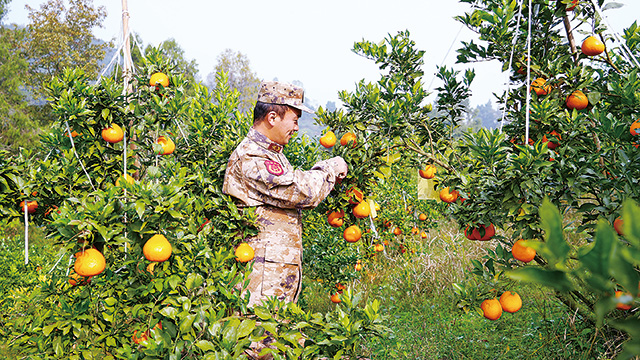 四川省資陽市雁江區(qū)人武部組織民兵幫助果農(nóng)采摘柑橘