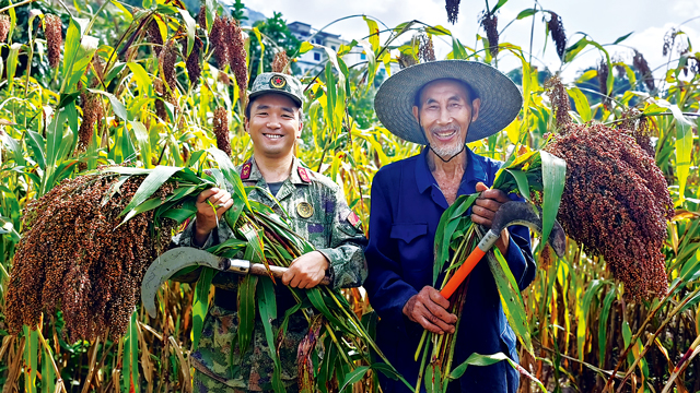 貴州仁懷市人武部組織民兵到龍井鎮(zhèn)復(fù)興村幫助村民收割高粱