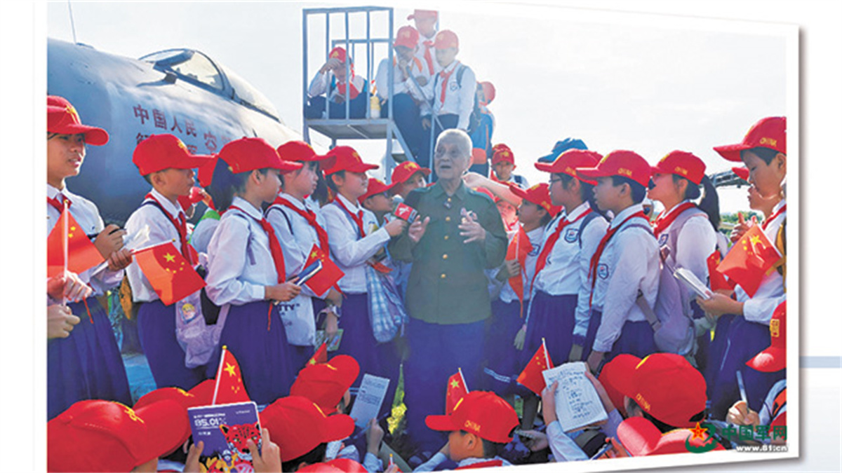 湛江軍事文化博覽園內(nèi),原空軍特級飛行員田欣民為學(xué)生講述戰(zhàn)斗故事。顧橋紅攝