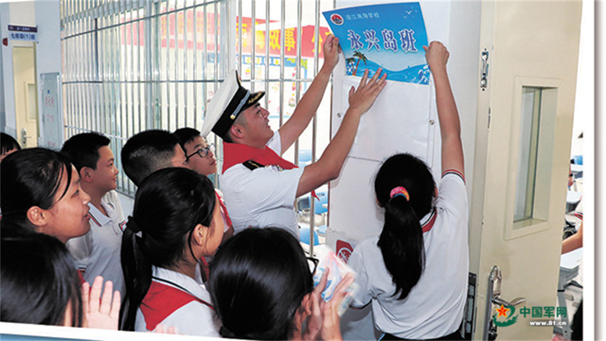 和海軍官兵一起將“永興島班”的標牌掛在門口,湛江南海學(xué)校七年級一班學(xué)生們的臉上寫滿自豪。