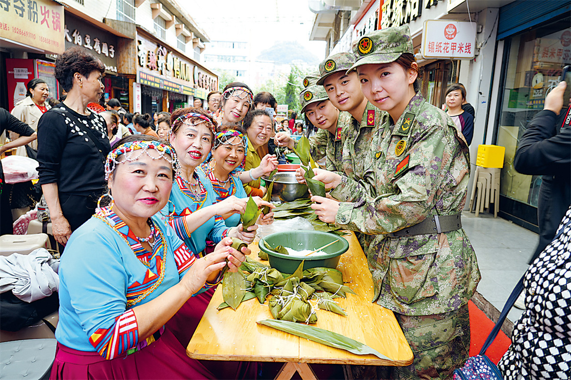 臨近端午佳節,貴州省六盤水市鐘山區人武部組織工作人員走進社區,與軍屬和社區群眾共慶傳統節日。