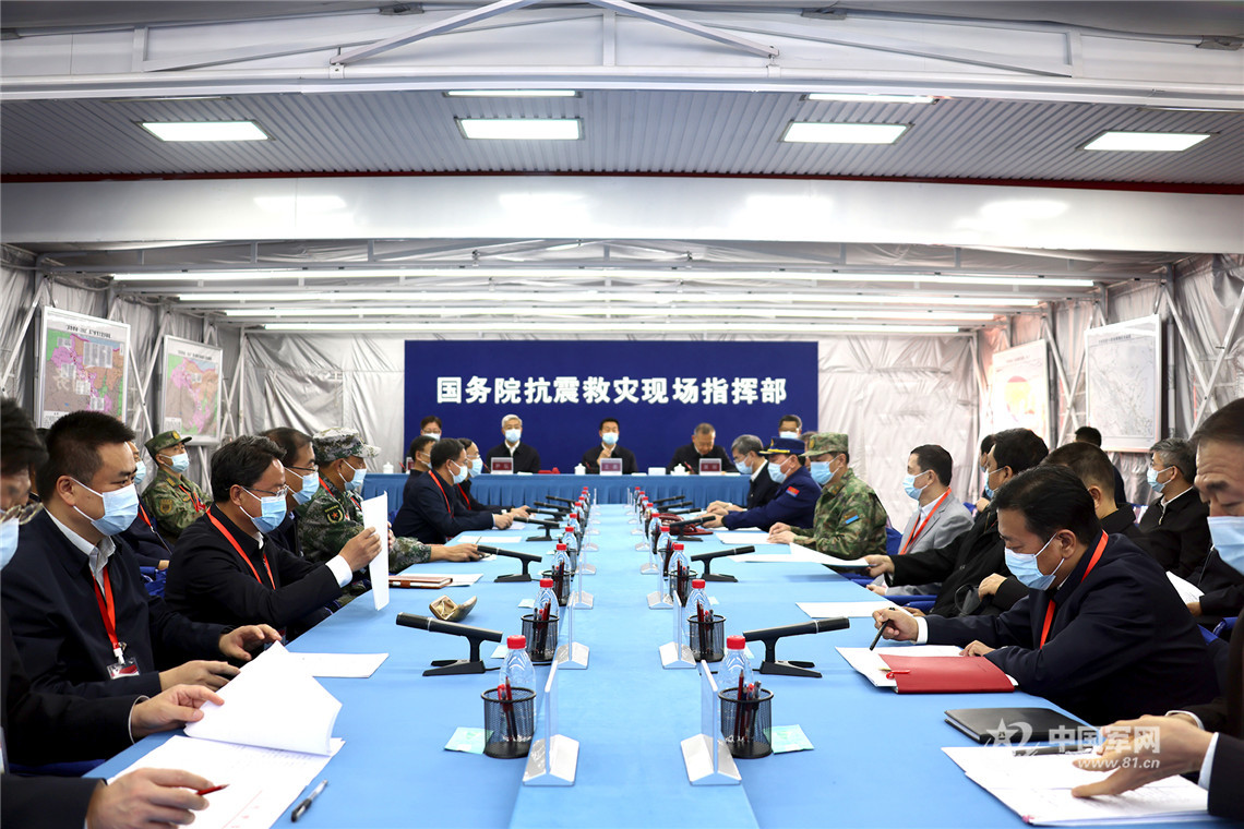 國務院抗震救災現(xiàn)場指揮部聽取情況匯報。王連彬 攝