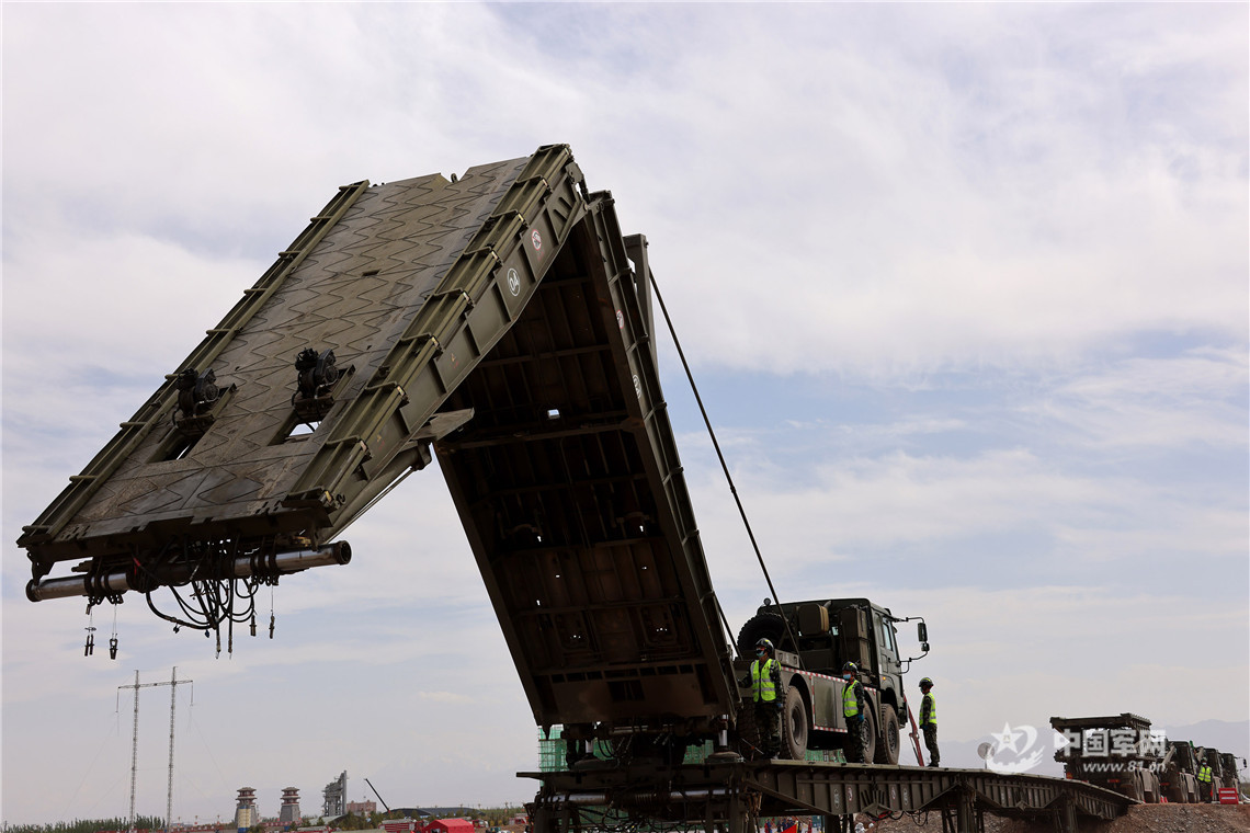 陸軍第76集團軍某工程防化旅橋梁架設組正在推出重型支援橋橋跨。王連彬 攝