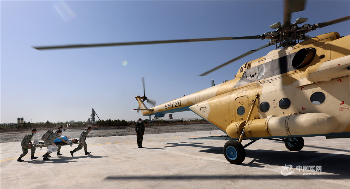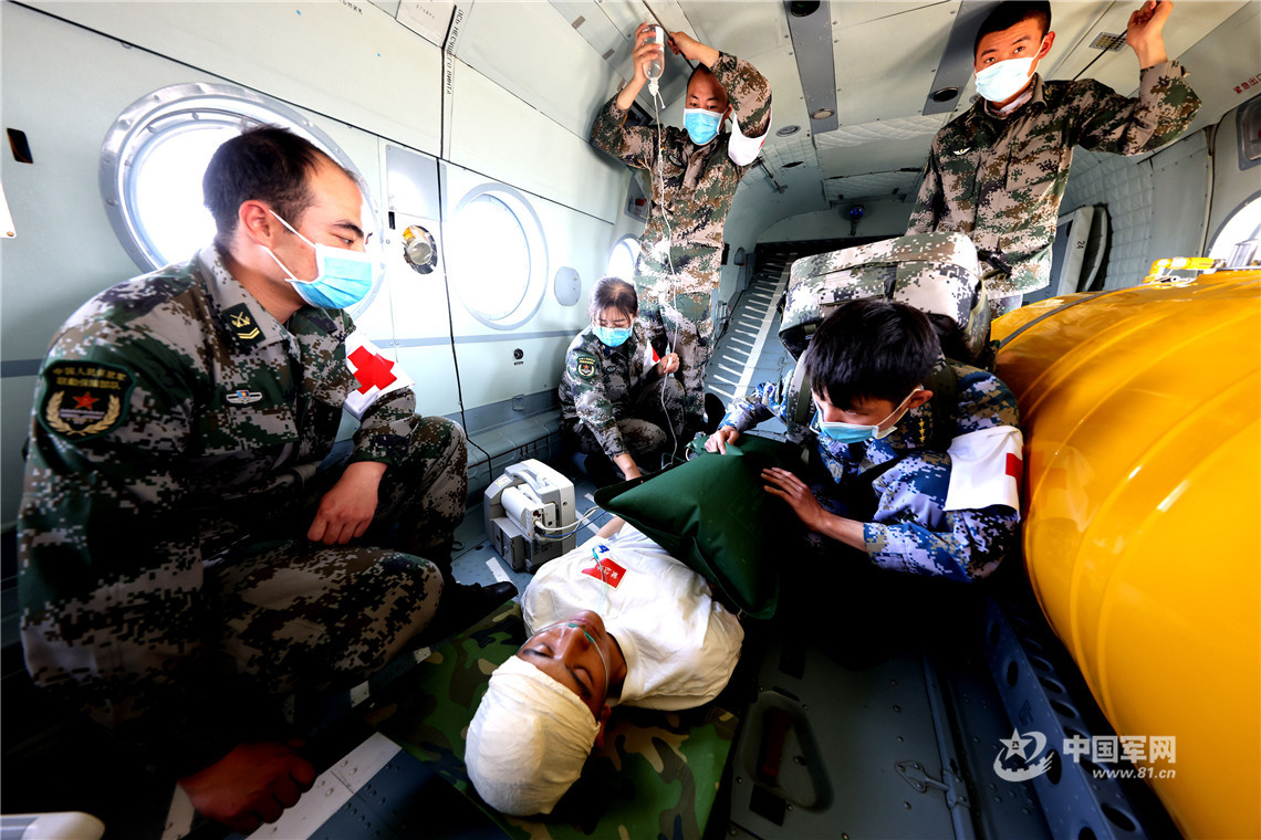 演習現(xiàn)場,第76集團軍某工程防化旅、武警第一機動總隊某交通支隊派出專業(yè)工程車輛緊急搭設公路應急橋梁,打通通往“震中”的生命通道。聯(lián)勤保障部隊第944醫(yī)院于“震中”聯(lián)合開設野戰(zhàn)醫(yī)院,對傷員進行快速檢傷分類和緊急救治,并通過遠程會診系統(tǒng)在專家團隊的指導下開展急救和損傷控制手術。第76集團軍某陸航旅出動運輸直升機投送救援力量,并緊急轉(zhuǎn)運危重傷員。西部戰(zhàn)區(qū)空軍醫(yī)院派出16名醫(yī)護人員緊急進駐張掖機場,依托運-9醫(yī)療救護飛機展開重癥傷員空運醫(yī)療后送。