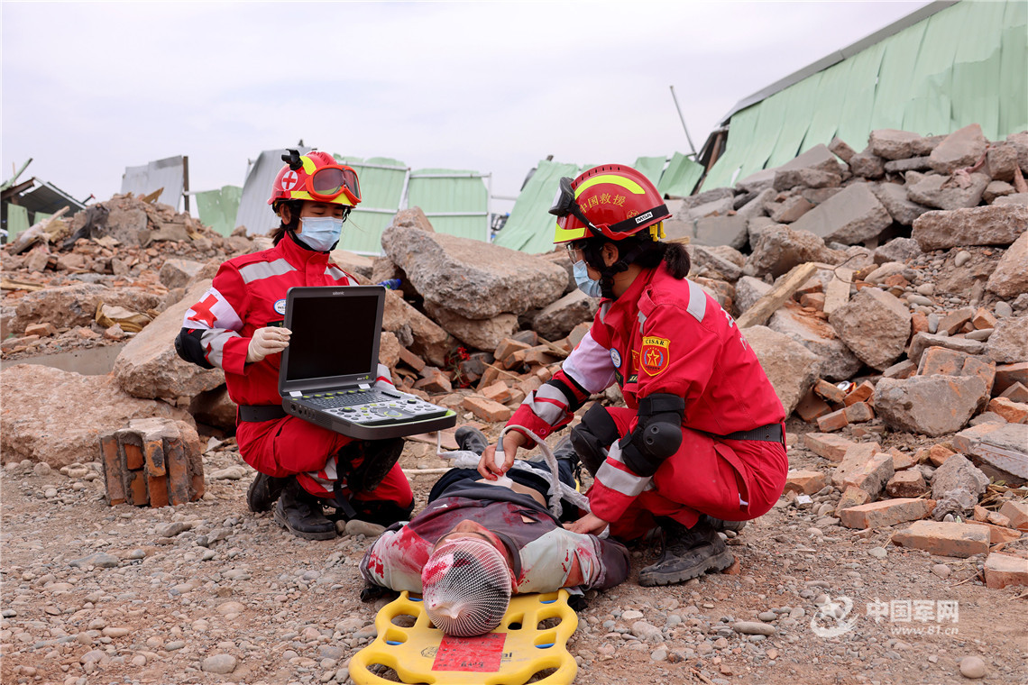 中國國際救援隊隊員利用遠程超聲儀對“傷員”進行檢查。王連彬 攝