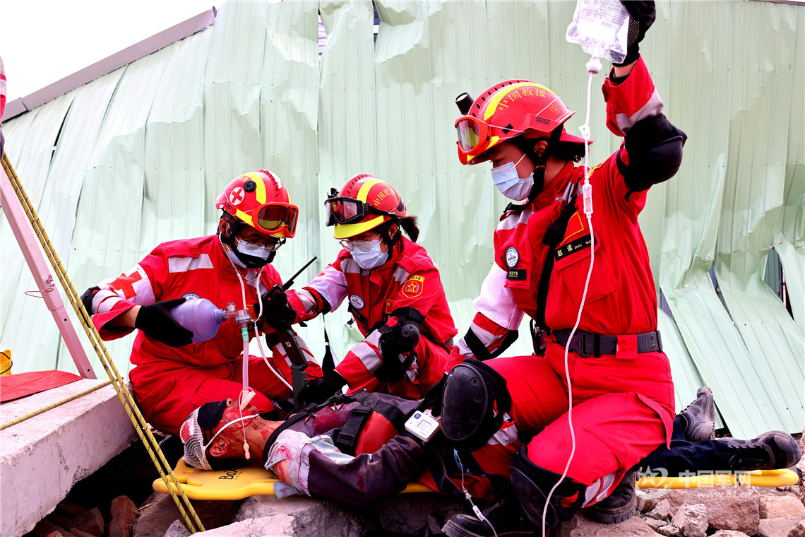中國國際救援隊隊員對“傷員”進行胸腔閉式引流。王連彬 攝