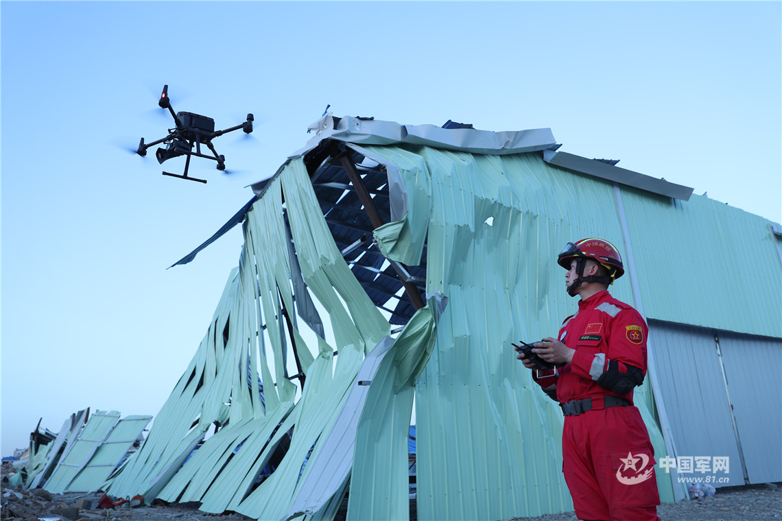 中國國際救援隊隊員使用建模無人機進行廢墟建模作業(yè)。王連彬 攝