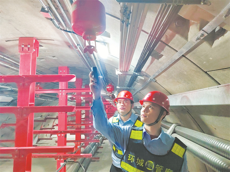 在廣州市區某綜合管廊內,工作人員檢查智能化消防滅火設備。曾 毅攝