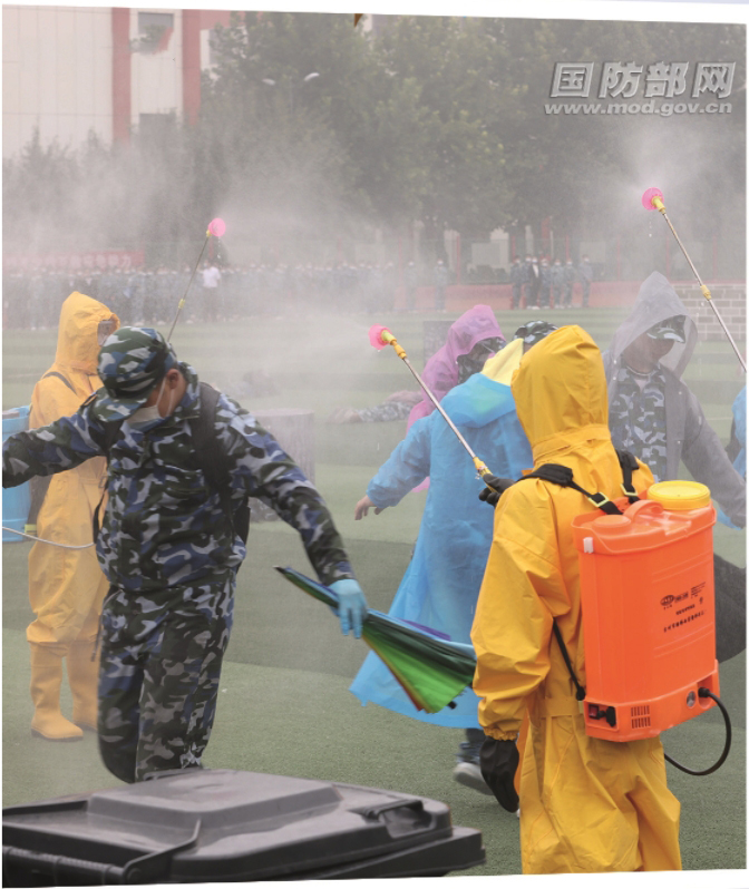 陜西省合陽縣第三中學開展消除空襲后果課目演練。圖為參演人員進行洗消作業。母家亮 攝