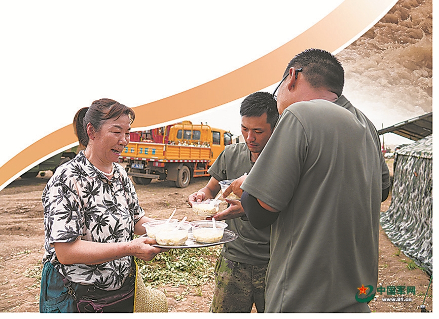 堤壩上,幾位村民推來小車,為官兵送上清涼解暑的綠豆湯。