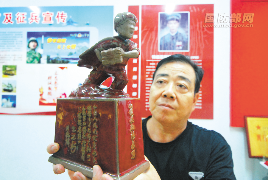 同年7月15日,該市組織雙擁進軍營活動,劉國賢作為工作人員也來到闊別已久的軍營。參觀部隊榮譽室,了解楊根思的英雄事跡,劉國賢萌生了一個想法:當一名國防教育志愿者,“用心塑英雄雕像,用情講英雄故事”。鈞瓷是我國五大名瓷之一,是當地的一張名片。他先后請來瓷藝設計大師對楊根思雕像反復觀察測量,按照1∶20比例制作鈞瓷模型,經過無數次試驗,終于成功燒制出英雄雕像。