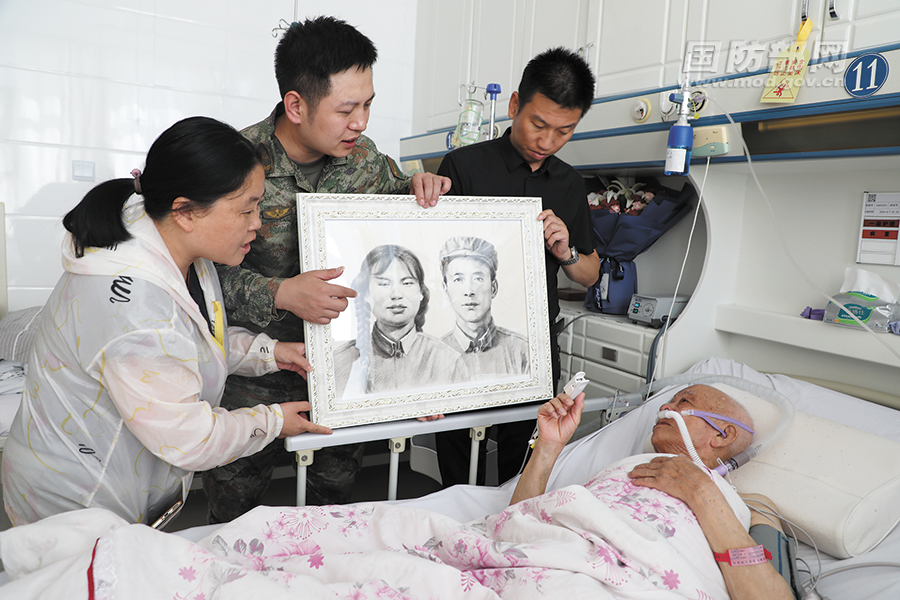思念可抵歲月漫長。55年過去,91歲高齡的于志林身體每況愈下,但心中的一個愿望卻越來越強烈。他與妻子唯一的一張合影早年間遺失,后因種種原因一直沒有再合影?!耙悄芘c龍珍再‘合’張影就好了?!庇谥玖謺r常念叨。今年春節前夕,新疆生產建設兵團第九師人武部、白楊市退役軍人事務局領導走訪慰問時得知了老人的心愿。“我們在媒體報道中了解到,‘舍己救人模范軍官’孟祥斌的遺孀葉慶華多年來致力于為烈士尋親、為烈士畫像等公益活動,便試著與她聯系。她立刻為我們牽線安徽師范大學‘紅色青春守護人’工作室,幫忙繪制合影?!钡诰艓熑宋洳款I導說。