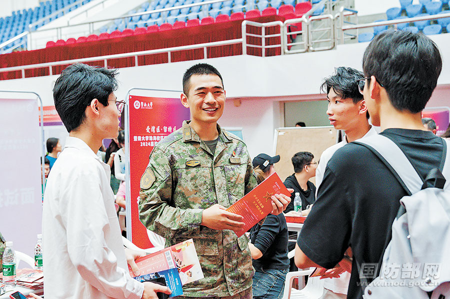 日前,在暨南大學珠海校區畢業生就業雙選會上,廣東省珠海市香洲區征兵辦工作人員為大學畢業生宣講入伍政策,鼓勵他們踴躍報名應征。阮雨家 攝